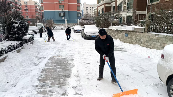 尽管寒风刺骨,大家脸冻红了,手也麻木了,却无人退缩。经过数小时奋战,小区积雪被清理干净,保障了业主出行安全,也为新年增添一份温暖与安心。