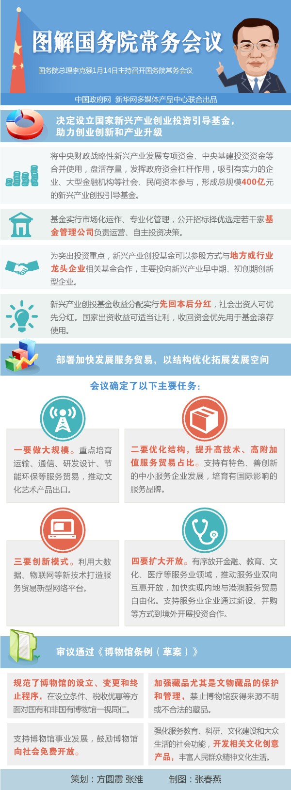 国务院总理李克强1月14日主持召开国务院常务会议,决定设立国家新兴产业创业投资引导基金,助力创业创新和产业升级;部署加快发展服务贸易,以结构优化拓展发展空间;审议通过《博物馆条例(草案)》。
