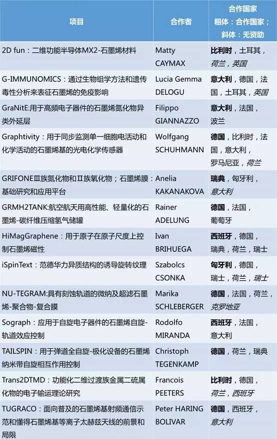 这13个新增“石墨烯旗舰计划”项目中:4个项目涉及先进的纳米加工和自旋电子学,3个涉及新的层状材料和异质结的领域,其他的覆盖了各个不同的领域包括免疫学和蛋白质组学,生物和化学传感器,功能性涂料,纳米流体的应用,设备和系统的计算模型和原型。