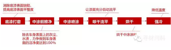 汽车中涂涂装的目的是底漆、面漆涂膜的保护和“装饰”。底漆用的阴极电泳涂料的主要功能是对钢板的附着力和防锈力,涂面漆的主要目的是美观和耐候性等。因而涂料的颜料、树脂组成等的设计是有差异的。面漆直接涂在底漆层上,附着力较差,透过面漆涂膜的紫外线使耐候性差的电泳涂膜产生粉化,短期内引起漆膜剥离和生锈.为此,在底漆涂层与面漆涂层中间涂中间涂料,以此来提高涂层的附着力和涂膜的耐久性。