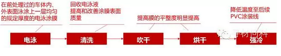 电泳漆使车身获得防锈、防冲击、耐腐蚀等性能。而且电泳相比于其他的喷涂来说,具有更好的涂装均一完整性,可以涂装到汽车车架、零件等结构件的内腔、夹缝等隐蔽的内部,大大提高了工件内腔的防腐。