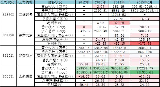 我们对二维碳素、第六元素、兆鋆新材、圣泉集团四家挂牌公司的年营业收入及总资产进行统计,具体情况如图2所示: