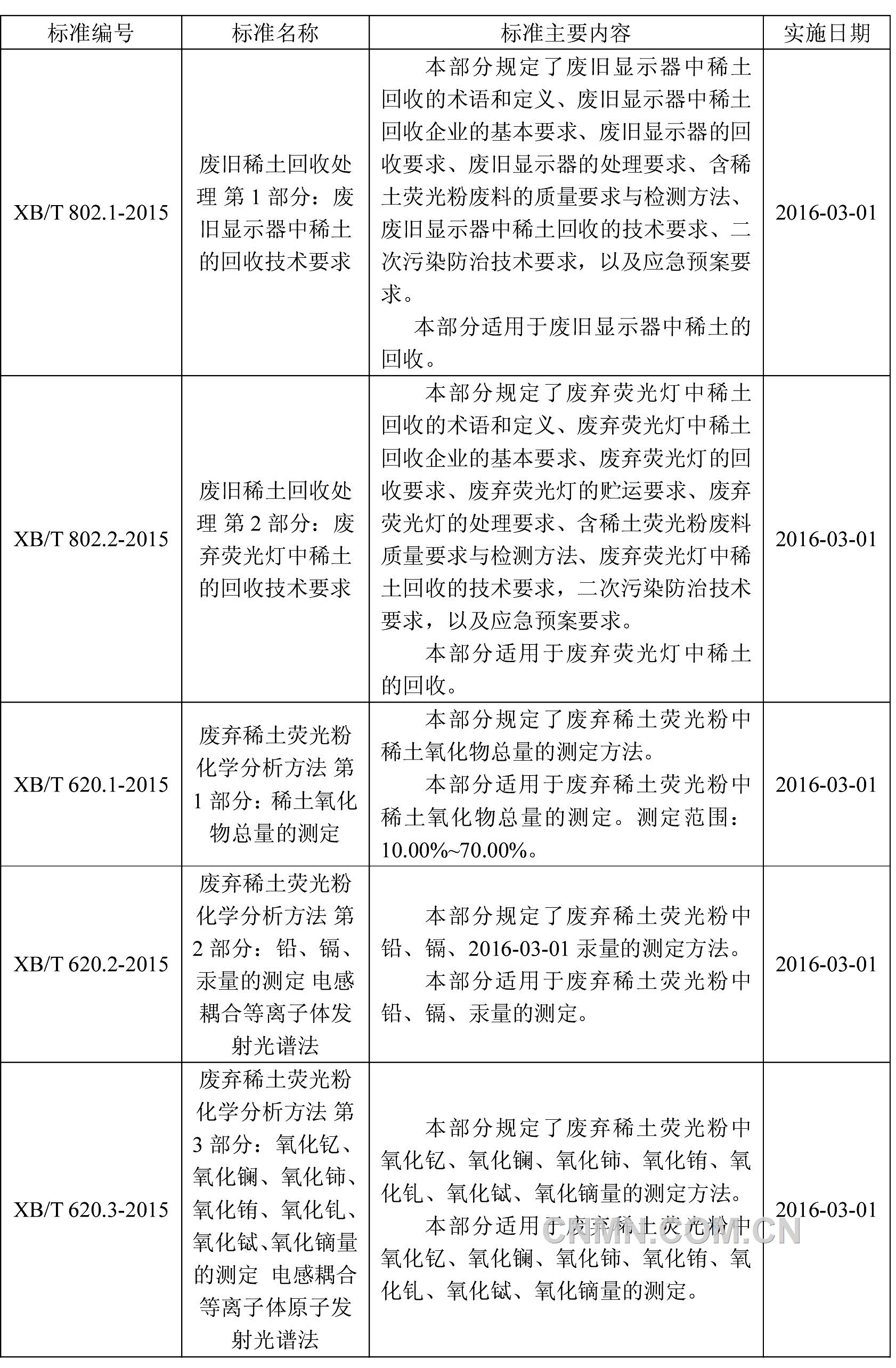 据了解,本次发布的5项稀土行业标准为:《废旧稀土回收处 理第1部分:废旧显示器中稀土的回收技术要求》(XBT802.1-2015)《废旧稀土回收处理第2部分:废弃荧光灯中稀土的回收技术要求》 (XBT802.2-2015)、《废弃稀土荧光粉化学分析方法第1部分:稀土氧化物总量的测定》(XBT620.1-2015)、《废弃稀土荧光粉化学 分析方法第2部分:铅、镉、汞量的测定电感耦合等离子体发射光谱法》(XBT620.2-2015)、《废弃稀土荧光粉化学分析方法第3部分:氧化钇、氧 化镧、氧化铈、氧化铕、氧化钆、氧化铽、氧化镝量的测定电感耦合等离子体原子发射光谱法》(XBT620.3-2015)。上述标准将从2016年3月1 日起开始实施(标准详情见表格)。