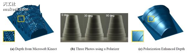 “今天,摄影师会在2D相机上使用偏振滤镜以获得令人惊叹的照片。我们因此 提出了一个问题:如果在一台3D照相机上使用偏振滤镜效果会怎样?答案是,普通商品级的毫米精度深度传感器,可提高到微米级的精度,也就是说将分辨率提升了3个数量级。”研究人员解释说。