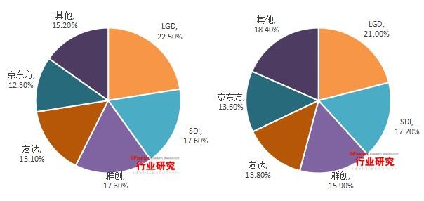 图表1 2015年Q3(左)和Q2(右)全球大尺寸液晶面板市场份额