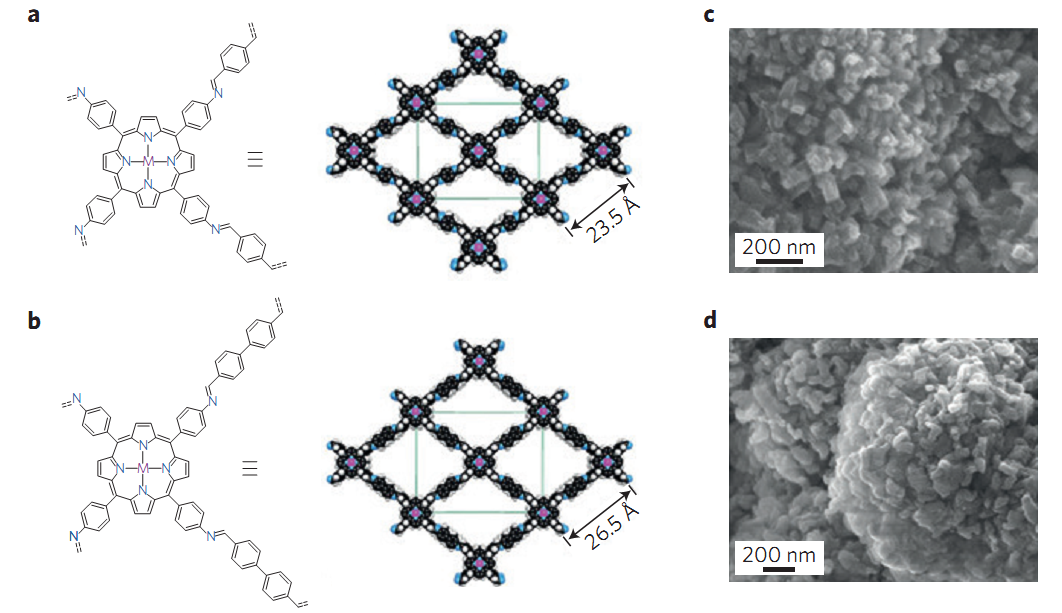 图1.金属卟啉衍生COFs的结构和特征。a,b为金属COF-366(a)和COF-367(b)的分子结构和骨架成分。c,d为COF-366-Co(c)和COF-367-Co(d)的扫描电子显微镜图像。