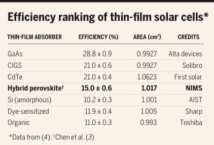仅仅在发现六年之后,由于有机物——铅——卤化物型钙钛矿太阳能电池的光电转换效率达到了20%,因此成为光伏技术的主力军之一。这种钙钛矿前驱体的原料非常丰富且便宜,也很容易转换成薄膜。因此从原理上来讲,钙钛矿型光伏电池的产生电能的成本很低。然而,只有小型装置可以达到较高的转换效率。在相关报道中一平方厘米的钙钛矿太阳能电池的转换效率只有15%。目前已经证实的钙钛矿太阳能电池的最高效率是在0.1平方米的面积尺度上实现的。为了能够和其他光伏技术相比较,其照射面积至少需要达到1平方厘米。目前也有很多关于制造大尺寸装置的研究,同时也取得了一些进步。