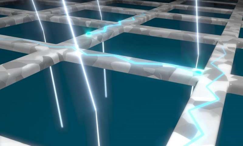 图像显示了通过新技术制备的银纳米线网络。从上到下的白线代表光线,其通过晶格沿着直线前进。蓝线是不能直接通过的电子,因为它们散落在银晶体之间的界限。单个晶体通过色彩对比可见。来源:Henk Jan Boluijt / AMOLF