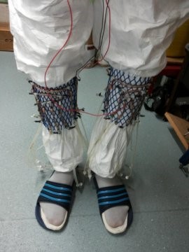 在一双袜子中柔软的微生物燃料电池由尿液供能,当人行走时仪器对它进行循环。通常来说,连续流动的微生物燃料电池需要一个主要的主能量泵来让尿液在微生物燃料电池中循环,但是这个实验依赖于人类的活动。这个手动泵是以简单地鱼类循环系统作为基础,步行这个活动使得尿液流过生物燃料电池来提供能量。放在轮子下面的软管保证了走动时液体的流入和流出。这个可穿戴的微生物燃料电池能够成功地启动一台无线发射机板,从而向电脑每隔2分钟传送一个信号。