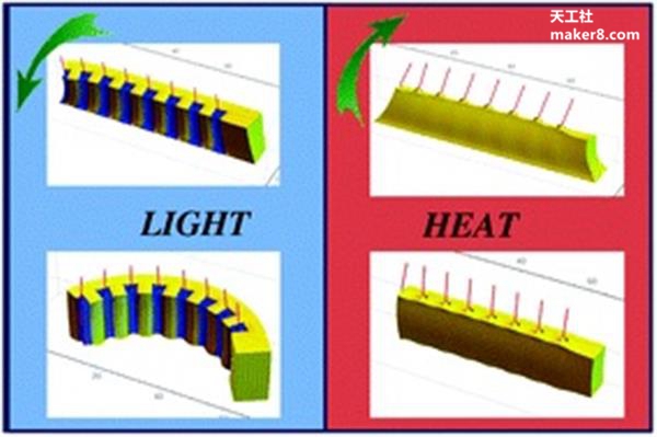 例如,Balazs和Kuksenok博士发现,当被锚定到一个表面上时,该复合材料在暴露在光照之下时会向一个方向弯曲,而受到热刺激的时候则会向其它方向弯。当与表面分离时,该样品“在被加热时会像手风琴一样缩小,而被照亮时又会像一条毛毛虫那样卷曲”。这意味着,一个单一的对象可以根据它所变形的形状而实现不同的功能,而且它的行为是完全可编程、可预见和多方面的。