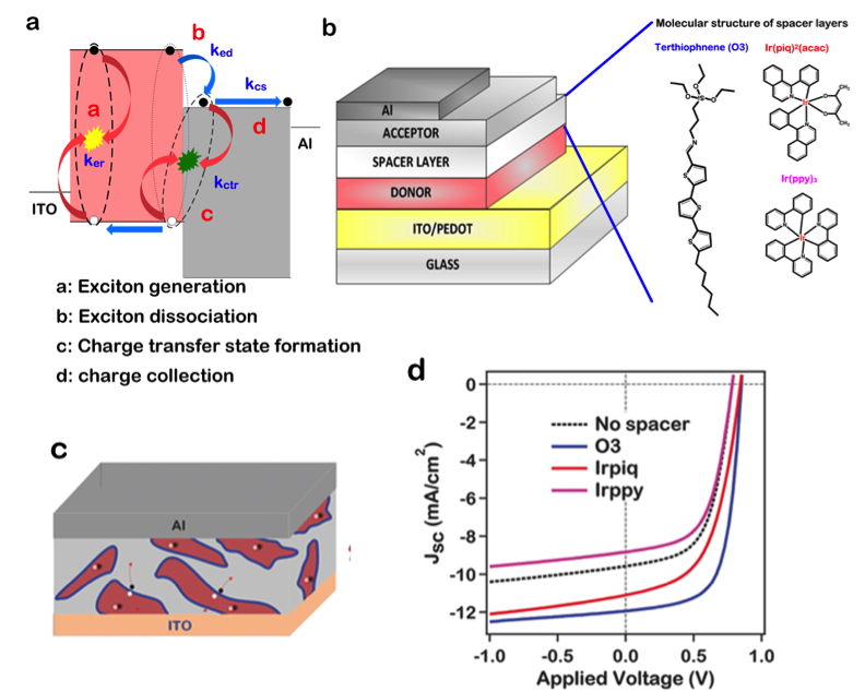 太阳能光伏是一种将太阳能(阳光)转换为直流电能的技术。高效的光电转换是由电子(或能量)在薄膜器件中各个界面有效的传导而实现的。在薄膜光电器件的技术中,有机太阳能电池在下一代薄膜太阳能光伏技术中的一种具有潜力且低成本的选择。然而,与硅等无机材料制成的传统电子器件中良好的界面传输不同的是,有机材料的界面存在一定的无序性,这极大地限制了光电转换效率。为了解决这一问题,研究人员需要深入理解材料在能量转换中的光物理机理。在有机太阳能电池工作时,光电流的产生经由三个基本光物理过程组成(如图a):a,光激发有机吸收材料从而产生电子 – 空穴对(激子),随后激子迁移到一个donor-acceptor界面; b,这些激子在界面形成电荷转移态(CT态);接着c,电荷转移态被分离随后d, 电荷被电极收集到外电路形成电流。每个步都是以速率为主导的过程,这其中电子-空穴复合速率的相互作用决定了整体电池的转换效率。具体的说,激子和CT态分离率与复合率的竞争决定了器件的最终输出功率。因此,控制和操纵这些速率是实现最高转换效率的关键。