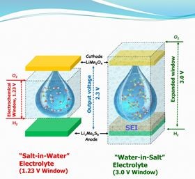 这一突破的关键在于含有超高浓度、精心挑选的锂盐的一类水系电解质。这种方法改变了电池的化学反应,导致在负极上形成一层很薄的保护薄膜,这在水系电池中是首次出现。电池科学当中成为固体电解质界面(SEI),这种保护性的稳定薄膜是先进锂离子电池高性能特征所必需的,但过去只在污水的电解质溶液当中实现。