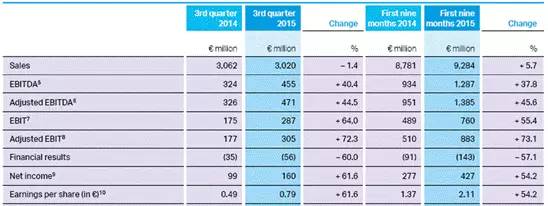 2015年全年,集团销售额增长率预期可约达10%, 除去特殊收益后的EBITDA将略有提升, EBITDA利润率则将略有下降, 投资利润率(ROCE)预计将略低于上年(8.4%)。 集团年终利润预计将略低于上年。