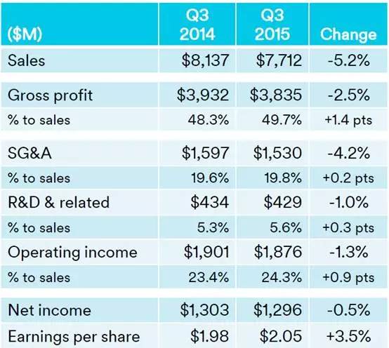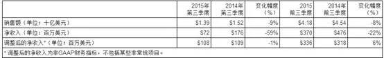 净利润:12.3亿美元,上年同期为23.9亿美元。经一次性项目和库存变动调整后净利下滑40%,至18.2亿美元。