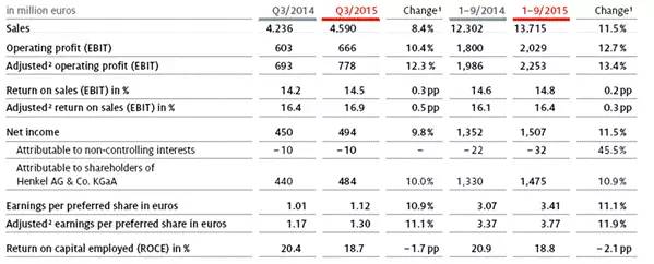 2015财年洗涤剂及家用护理业务部的预计销售额增长4-5%。在化妆品/美容用品业务部,预计销售额增长约2%。粘合剂技术业务部销售额增长将在2%到3%左右。汉高确认调整后销售利润率(EBIT),预计增长约16%(2014年为15.8%),汉高已经上调了优先股每股调整后收益,并且目前预计增长将超过10%(2014年:4.38欧元)。