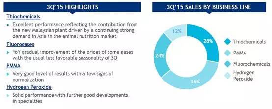 - 9月,赢创与荷兰过氧化学公司签署了最终协议,并将于2015年第四季度完成对其收购。双方协议不对外公开收购价格。该项目将增加赢创在欧洲过氧化氢的产能。