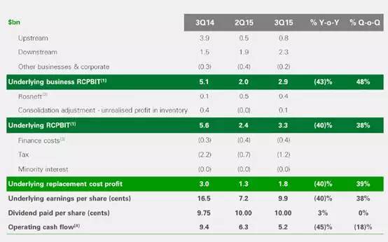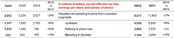 上游业务(油气勘探合生产)利润为13.6亿美元,同比锐减79%,得益于油气价格下跌,公司下游业务和化工部门利润增长。第三季度下游业务(油气加工和营销利润增加一倍,达到20亿美元。)