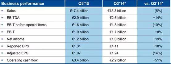 经济低迷、油价下跌以及与Gazprom进行资产交换将为第四季度的销售额和收益带来压力,预期2015年销售额和不计特殊项目的息税前收益将小幅下滑。