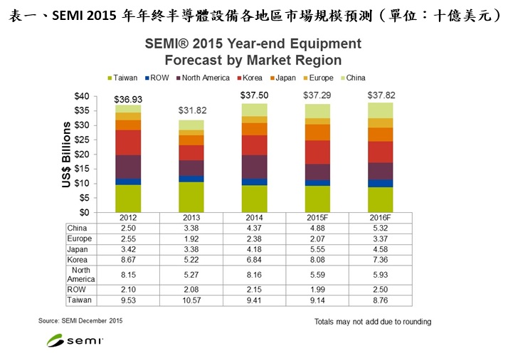 根据 SEMI(国际半导体产业协会)最新公布的年终预测报告,2015 年全球半导体制造设备市场营收达 373 亿美元,较去年微幅下滑 0.6%,为。2016 年则可望出现正成长,预估全球市场营收将上扬 1.4%。