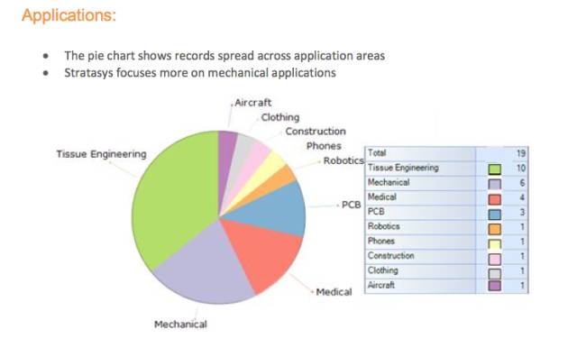 Stratasys在专利的行业应用方面亦是包括了组织工程,机械,医疗,PCB,机器人自动化,电话,建筑,服装和航空航天领域。