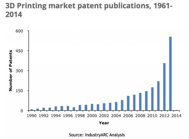 3D打印市场的专利,1961-2014 / 来源:IndustryARC