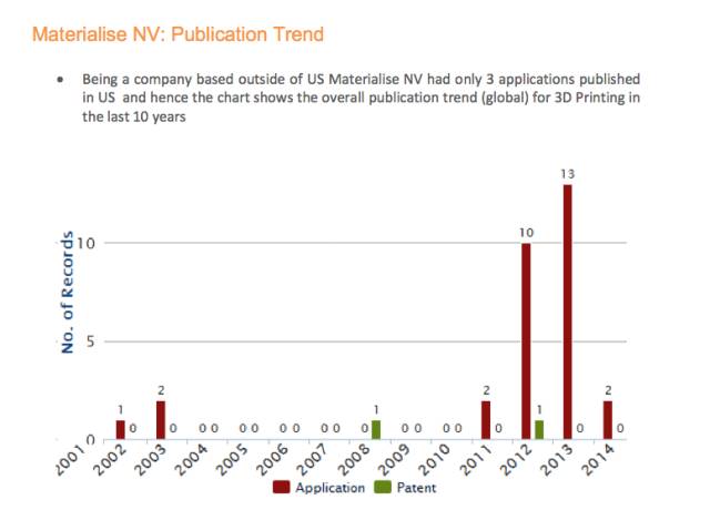 许多公司早有准备,我们看到包括3D Systems, Stratasys, Materialise在2013年就迎来了专利申请的高峰年。当然其申请不仅仅局限于设备,而是在应用和材料方面出现更多的专利申请。3D科学谷为您拉近看看专利大户们的具体情况。