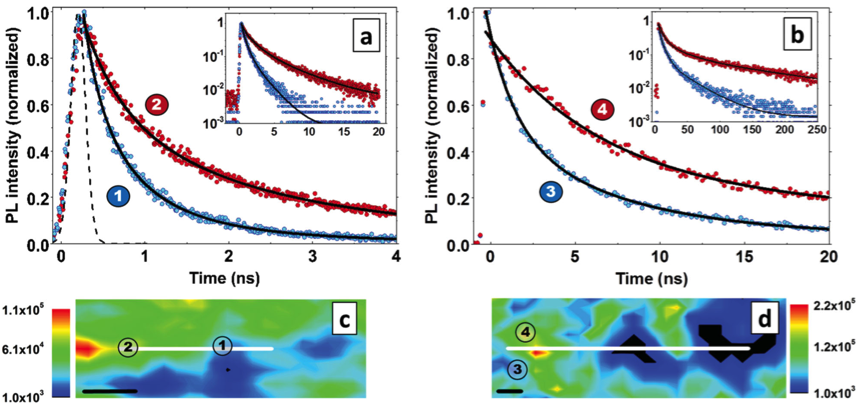 图1. 钙钛矿薄膜CH3NH3PbBr3(a,c)和CH3NH3PbI3(b,d)的瞬态光致发光谱(a,b)和空间分辨发光强度分布(c,d)。