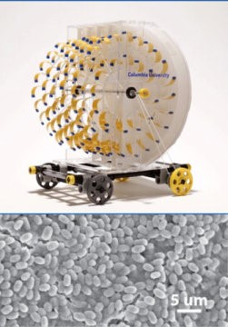 如图所示为旋转式引擎利用蒸发能量驱动的微型汽车。电子显微镜图像显示了利用细菌孢子制备的蒸汽动力“人造肌肉”聚合物组件。图片来源:哥伦比亚大学。
