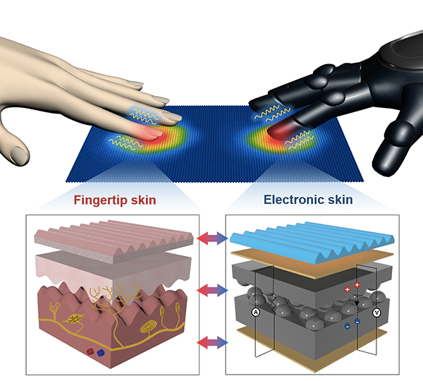 Ko和Lee想要更好地模仿人类皮肤。“人类皮肤的触觉非常敏感,这是由人类皮肤结构中的微观结构,不同的生物材料和不同的感受器所决定的。”Ko说。在人类皮肤的内层中有不同的感受器,一种可以检测连续的压力,其他的可以感受变化的压力和振动。同时介于外层皮肤和真皮层的传感器可以将指尖感知的信号放大,并且将信号转换后传递给感受器。不仅如此,不同的生物材料使得皮肤可以区分机械刺激和热刺激,例如极性角蛋白、弹性蛋白和胶原纤维。