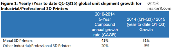 此外,2015年第三季度全球工业级/专业级3D打印机的总出货量为2743台,其中金属3D打印机仅占7%。但是按照销售金额计算,当季金属3D打印机的销售收入全球占比高达31%,比去年同期的22%又有提高。