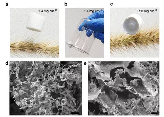 用六方氮化硼(h-BN)制备气凝胶和薄膜要比用石墨烯或石墨烯氧化物制备难得多,因为 h-BN 正在水中的分散性极差,这也因此限制了其剥离和制备胶体溶液。 Lei 等人报道了一种简单的一步机械化学法,来剥离和功能化 h-BN ,使之成为高度易分散于水中薄层 h-BN 。这种薄层 h-BN 胶体溶液可以达到非常高的浓度(30mgmL-1),并且可以稳定存放数月。以其制备的气凝胶密度仅有 1.4mgcm-3 ,比本体结构的 h-BN 轻 1500 倍。在紫外光激发下,这种材料可以发射出强烈的蓝光。(Nature Communications DOI : 10.1038 / ncomms 9849 )