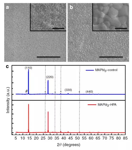 可溶液加工的金属卤化钙钛矿半导体(如 CH3NH3PbI3 )展现了很高的能量转化效率,尽管它也存在着不可忽视的缺陷态密度问题。一种可能的原因是钙钛矿晶体中存在卤素空缺或是存在金属铅,这导致 I/Pb 的化学计量比不平衡。 Zhang 等人发现,无论从电学角度还是从形貌角度讲,在前驱体溶液中加入一定量的次磷酸(HPA)可以显著的提高钙钛矿薄膜的质量和荧光强度。这使得电池具有更高的能量转化效率和重复性。研究发现,HPA可以将氧化的 I2 还原成 I- ,最终提升了钙钛矿晶体中的化学计量比。(Nature Communications DOI : 10.1038 / ncomms 10030 )