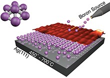 为了制得硼的单层片,Guisinger等人在超高真空腔室内加热单晶银衬底,以此来生长硼烯。他们采用电子束蒸发技术从450℃至700℃的固体硼棒上蒸发出硼原子。硼原子自发的沉积在银上面,形成2D片。相关结果发表在最新的《科学》(Science)期刊上。