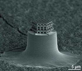 格子结构的框架和支架由玻璃碳材料构成,其长度小于1µm且直径只有200nm,与类似的超材料相比缩小了五倍。这些小尺寸材料使格子结构具有前所未有的强度密度比;可能的应用包括电极、过滤器或者光学组件。