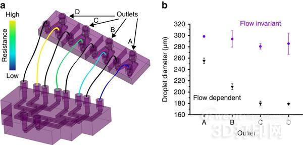 这种新方法的关键就是用250微米级的3D打印导管取代原先的传统导管、烧杯等工具,在相对较快的速度下捕捉纳米颗粒。这种尺度的导管传统工艺很难做出,而3D打印技术却能轻松实现。据了解,这种微型3D打印导管是使用光固化(SLA)技术制做的,具有均匀的网络结构。实际操作时,两束非混合液体会从一端注入导管,然后从另一端流出。流出时它们会相互碰撞,形成微米级的小液滴,最后以一种可预测的方式转化成纳米颗粒。每一个这种3D打印导管都可生成数百万单位的小液滴。