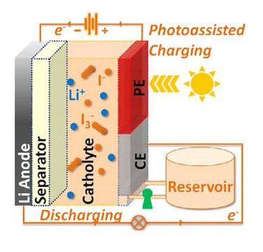 太阳能液流电池三电极示意图:锂阳极、对电极和光电极。对电极和光电极通过电解液相互接触。来源:Yiying Wu, The Ohio State University