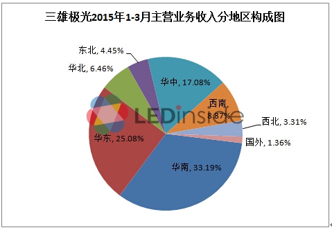 从三雄极光的2015年主营业务分地区构成图来看,三雄极光主要是以内销为主,占住98.64%。而国外仅占1.36%。其中就国内部分,主要分为华中、华南、华东、西南、西北、华北和东北7大区域。其中华东、华南和华东三大区域超过60%。