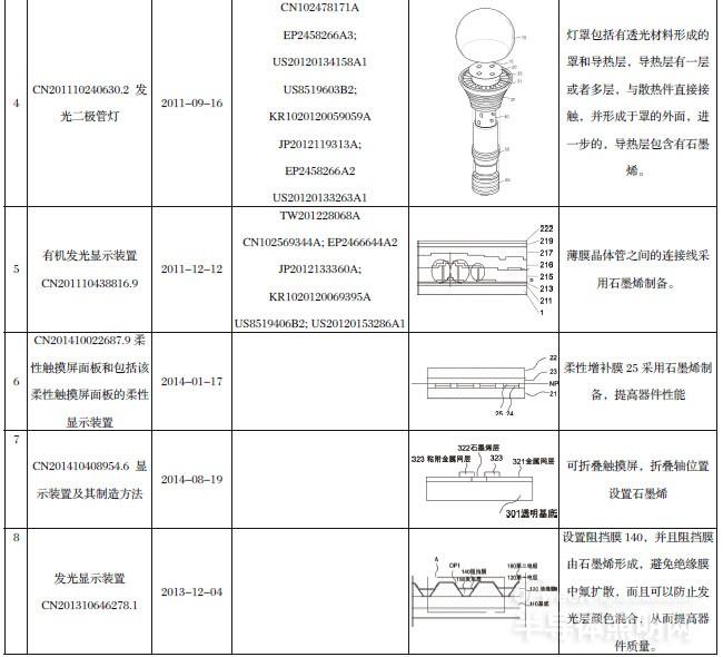 2)改进型:以专利2-8为代表,在原有结构上增设一石墨烯材料层(3,4,6,7,8),由于石墨烯的透明、导电、导热等一系列优点,增设之后可以弥补不足,从而取得了显著的技术效果;或者直接以石墨烯材料替原有的材料(专利5),从而取得显著的技术效果。以改进型专利居多,这类专利技术难度相对较低,国内企业在该类型专利申请的实力不弱于国外公司,而且长期代工,技术人员积累了大量的相关经验,更容易结合新材料的特性,提出改进的技术方案。