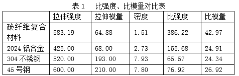 注:碳纤维复合材料数据为上海耀华大中公司采用T300碳纤维200g/m2平纹布和环氧树脂,通过真空导入工艺制作的试样测试的数据,金属材料为销售商提供的数据。
