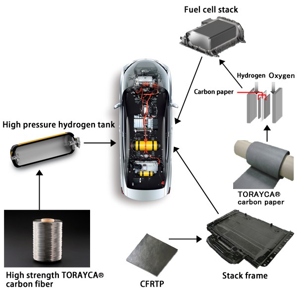 东丽与丰田合作开发的碳纤维增强热塑性复合材料,开发制造了燃料电池反应堆框架,应用于丰田燃料电池汽车Mirai中,碳纤维增强热塑性复合材料具有成型时间短的特点,与热固性相比,生产效率更高,适合大规模生产,这也是世界上第一次CFRTP用于汽车结构件而大批量生产的汽车(见图2)。