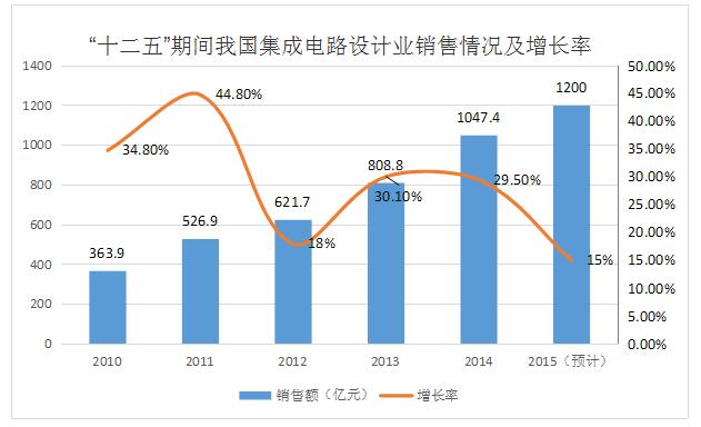 “十二五”期间,我国集成电路设计业一直呈现快速增长的态势。中国半导体行业协会的统计显示,2014年我国集成电路设计业销售收入为1047.4亿元,占我国集成电路产业的比重由2011年的27.2%提升至2014年的34.7%。根据机构预测,2015年销售收入将实现15%以上的增长,超过1200亿元。据此计算,和2010年的363.9亿元相比,“十二五”期间实现了230%以上的增长。