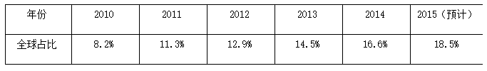 2010年~2015年我国集成电路设计企业销售收入全球占比情况