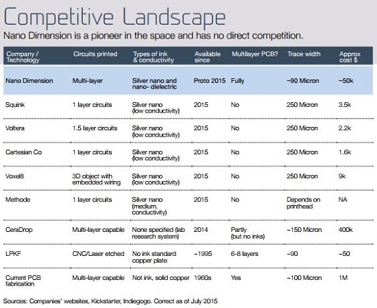 “复合”在这里是关键词,因为按照下表竞争分析,很多公司都可以打印出电路板,但是只有Nano Dimension公司才能用高导电的纳米油墨打印出“复合”电路板。