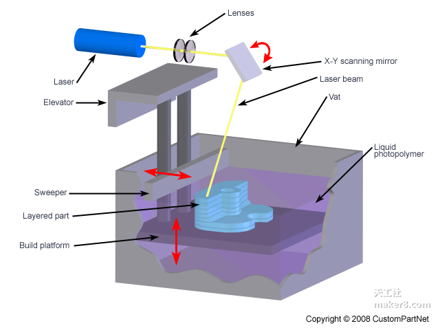 此外,在3D打印中使用的另一类塑料一般是液态的光敏聚合物。这种材料顾名思义就是当暴露在紫外线中时会改变其结构和形态,简单地说就是会被特定的光线照射后硬化。取决于光聚合物类型的区别,可以使用的不同光照射方法包括:立体光刻(SLA)、数字光投影(DLP)或多射流成型(MJM)等。不过Fram-Schwartz指出,这些材料由于其感光的特性很容易受到热和光的影响,因此它们通常不会被用于制造最终的产品或者零部件。