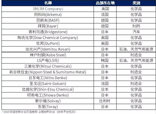 附3:2015年全球创新企业百强名单--材料企业名单(排名不分先后)