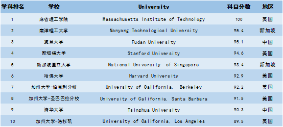 入围高校中,有31所学校进入了全球前一百名,复旦清华两所高校进入了前十名行列,复旦大学材料科学专业更是位列第三名,仅次于美国麻省理工学院和新加坡的南洋理工大学。