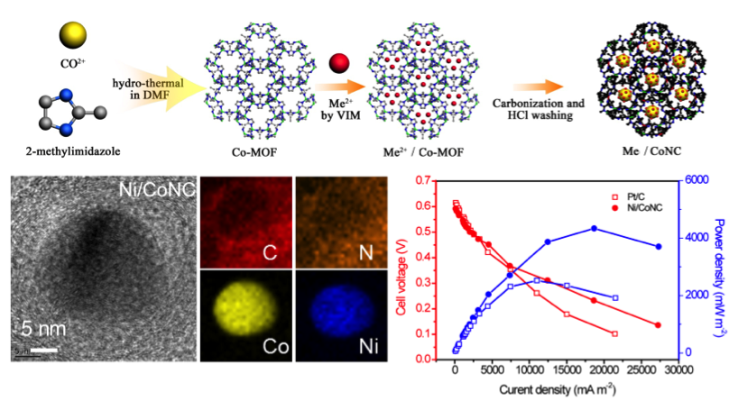 最近,武汉理工大学唐浩林教授与中山大学卢锡洪副教授最近共同合作开发了一种以金属有机框架(Metal Organic Framework)为前驱体的双金属碳氮共催化纳米材料。该材料以Co-MOF为前驱体,并掺杂Ni,Fe,Zn,Cu等元素,经过高温碳化合成双金属含氮多孔碳材料。金属以及氮元素均匀的分布在石墨化的碳材料中,为催化氧气还原反应提供了丰富的活性位点,而石墨化的碳则可优化电子传输通道,降低极化和内阻,保证了其在碱性及中性环境下优于铂碳的催化性能,这其中以Ni掺杂的材料性能最佳。在PBS (pH=7)缓冲溶液中其氧还原起峰电位在0.347 V vs. SCE,同时用它作为微生物燃料电池的阴极催化剂,组装成器件进行测试,发现其功率密度高达4335.6 mW m-2,并具有很好的耐久性,能够稳定运行755 h。该工作不仅开发出了一种性能优越的非贵金属微生物燃料电池阴极催化剂,而且提供了一个以MOF作为功能碳材料前驱体从而合成其他材料的普适方法。