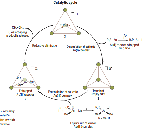 绝大多数的化学反应是由过渡金属化合物催化。在许多这样的过程中,还原消除反应是关键的产物形成步骤。对于金催化反应,先前的研究已经表明金原子(III)中心的还原消除反应通过配位体解离而进行,在释放碳-碳键耦合产物之前。基于他们的数据,Kaphan等人主张一种不同的过程,在被主体封装前,其中的卤化物与金复合物分离。这个过程在阴离子笼腔内生成一种瞬态金阳离子(III)二烷基复合物。由于笼子的空间拥挤,裹入的金()复合物自发地经历烷基-烷基交叉耦合反应,生成烷烃产品(见右图)。如果没有超分子笼,这个反应将会非常缓慢。