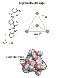 作者们使用一种超分子的笼状结构,通过有机配位体分子(连接器)和金属离子(节点)自组装而成(见左图)。主体分子是高度阴性的并包含有利于捕获阳离子化合物的疏水空腔,包含不同的有机和有机金属分子。在这种主-客体体系中,如芳香反应的非共价反应以及静电和疏水效应,主导着主客体分子之间的相互作用。这些相对较弱的力可以稳定活性中间体、加速化学反应和生成非热动力学产物的直接化学过程。