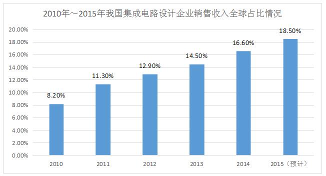 2010年~2015年我国集成电路设计企业销售收入全球占比情况